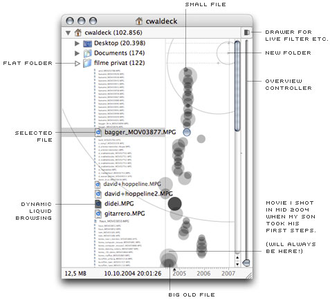 Liquifile is a file management alternative for Mac OS X. It is designed for visual thinkers who want to get a bigger picture of their files and feel them more directly. But not only for them ;-). Did you ever wonder why searching and browsing is so separated in today's interfaces? Ever wished you had a bigger screen when finding or organizing your files? Ever lost files in deep hierarchical structures? Ever wondered what the next big thing in file browsing might be...? Well, maybe you should have a look at this:
